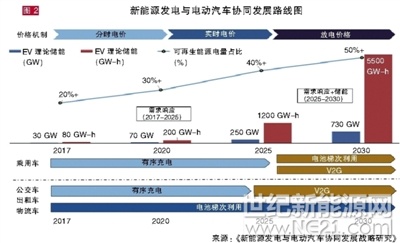 值得注意的是,《報告》發(fā)布了新能源發(fā)電與電動汽車協(xié)同發(fā)展路線圖(如圖2)?!叭鐖D所示,可再生能源發(fā)電量占比將從目前25%提升至50%以上,電動汽車儲能理論潛力也將從目前的30GW-100GWh提升至700GW-3800GWh?!眲詮?qiáng)調(diào),在不同時段引入合理的價格機(jī)制和并網(wǎng)模式是發(fā)掘電動汽車儲能潛力的關(guān)鍵。